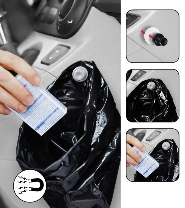 Simply place the included adhesive metal plate in your car where you want to hang the garbage bag. Then attach the bag to the metal plate using the powerful magnetic hook. The hooks and bags are designed to fit most car interiors. You can also use it anywhere in your home, caravan, or boat.